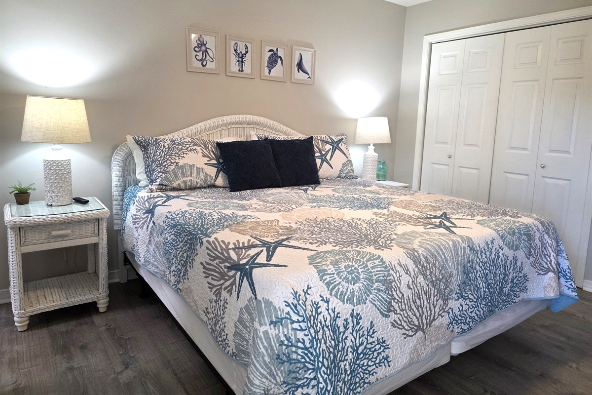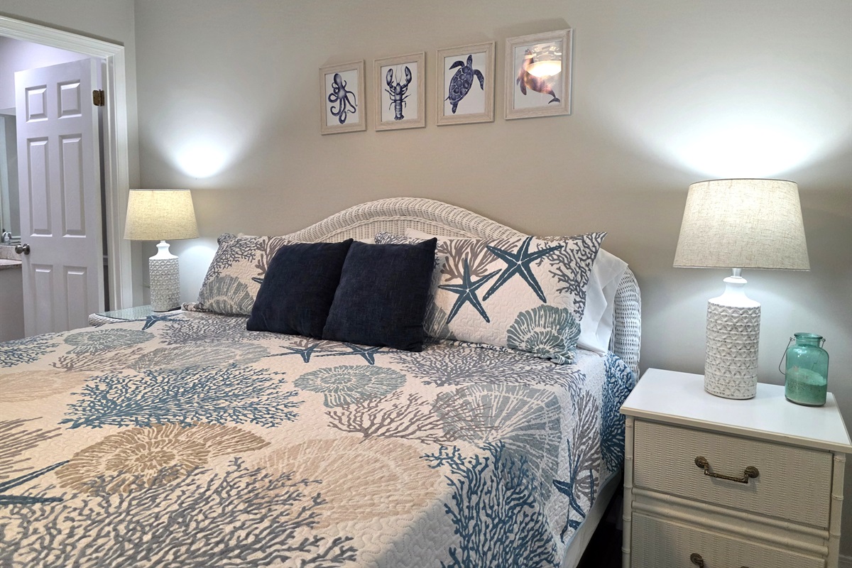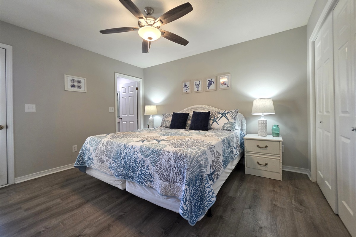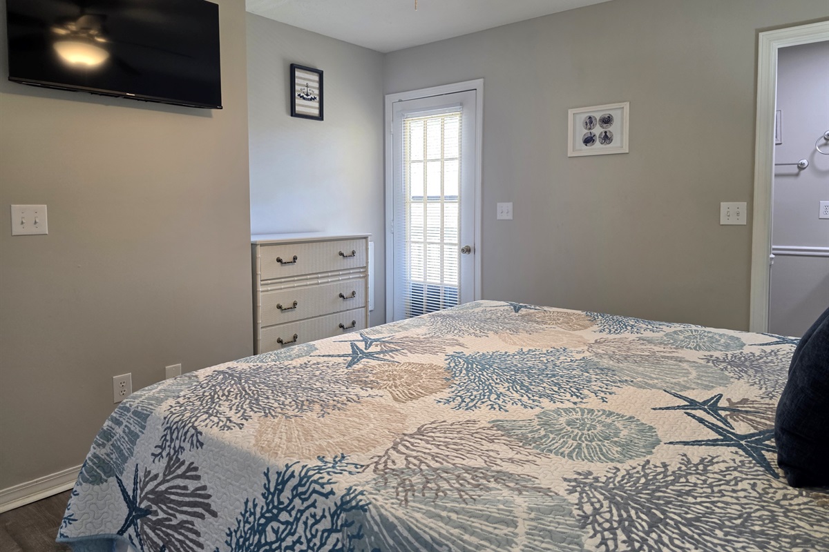 - main bedroom with king bed, attached full bathroom, and private balcony